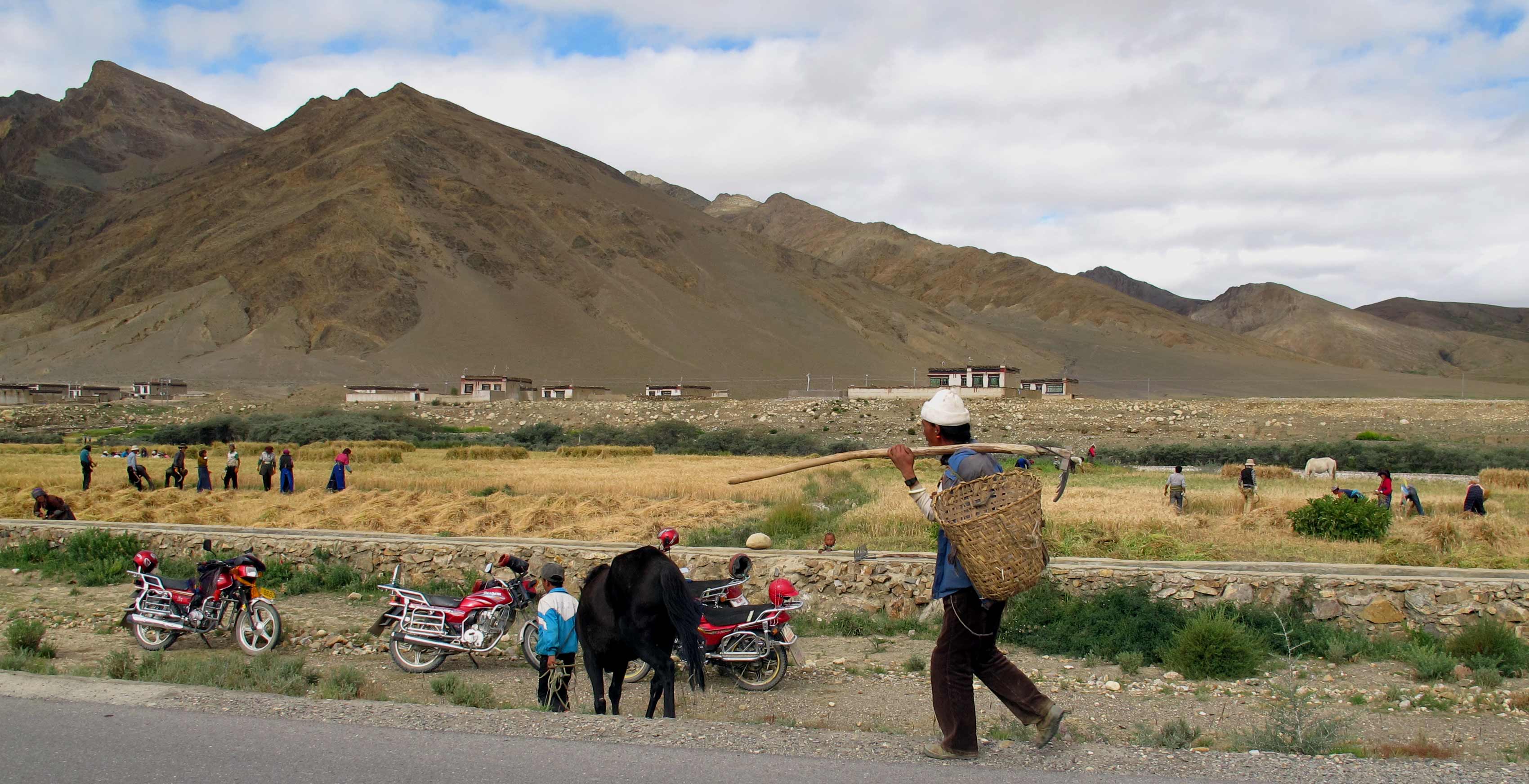 Having lost a day to the landslide, we did not have the time to stop anywhere for an extra day or visit monastries like Sakya, which was a detour on the route to Shigatse, Tibet’s second-largest city, where we reached the following day after another 240-odd kilometres. On the way we crossed two mountain passes: Gyatso La (at 5,248m, Tibet’s highest pass) and Tso La (4,750m). On the last stretch to Shigatse, the highway swung by villages. September is Tibet’s only harvest season, so villagers were out in full strength.